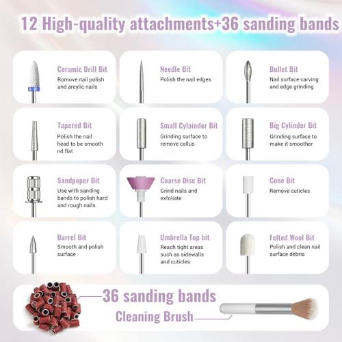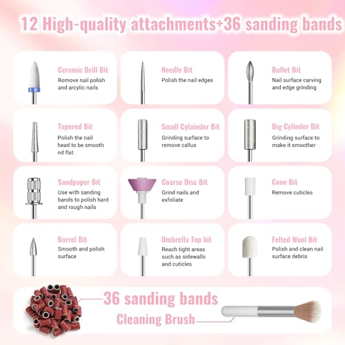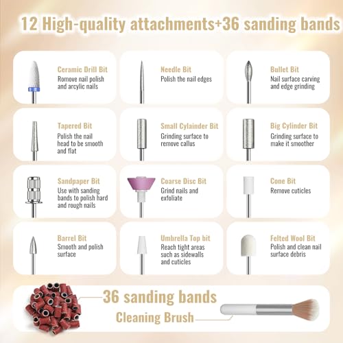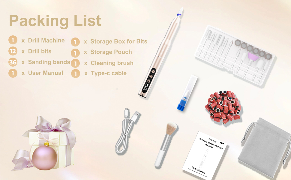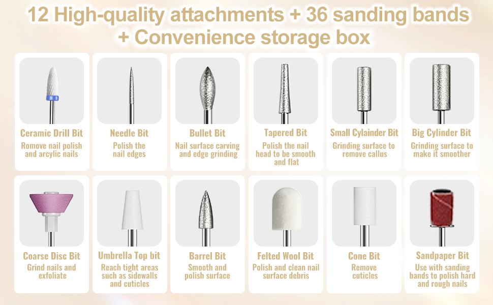 Dieser Nagelfräser wird mit einem kompletten Set geliefert, das 11 hochqualitative 3/32“ Metallbohrer, 1 Keramikbohrer, 1 Bürste, 36 Schleifhülsen und eine praktische Aufbewahrungstasche enthält. Damit sind Sie bestens ausgestattet, um Ihre Nagelpflege auf ein neues Level zu heben.