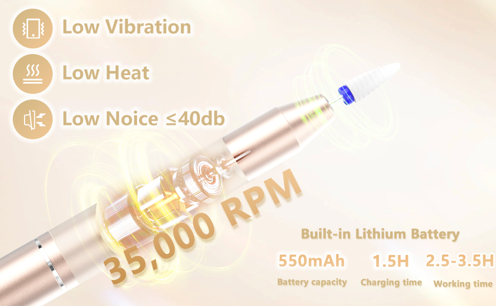 Mit dem mitgelieferten Type-C-Ladekabel und dem integrierten 550 mAh Akku ist unser Nagelfräser innerhalb von nur 1,5 Stunden vollständig aufgeladen. Genießen Sie eine Nutzungsdauer von 2,5 bis 3,5 Stunden – ganz ohne störende Kabel für grenzenlose Freiheit bei Ihrer Nagelpflege.