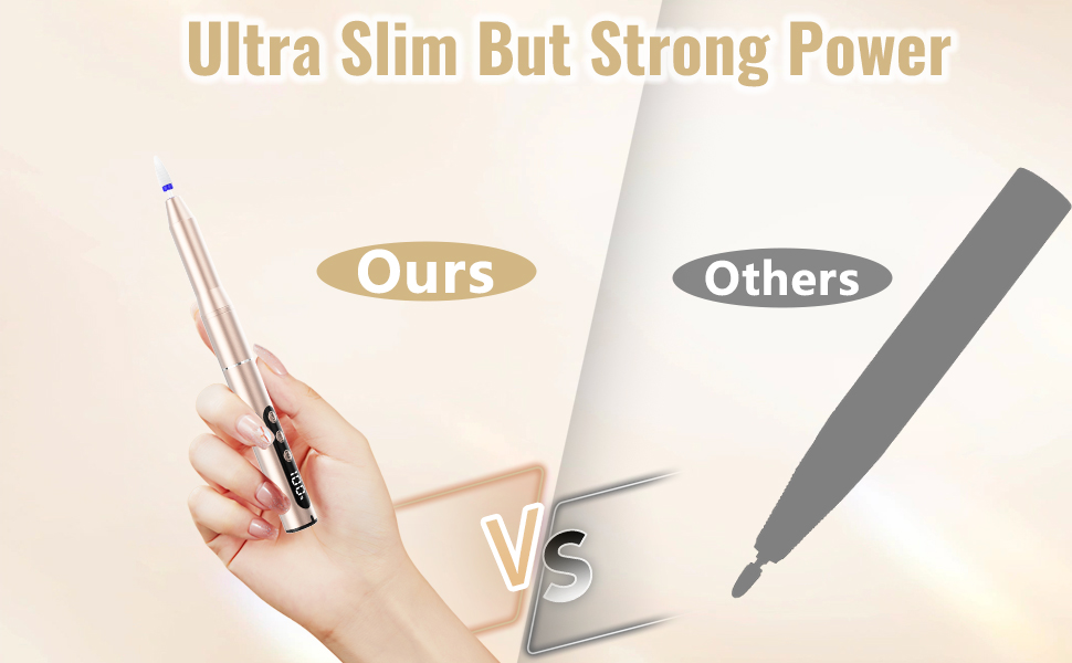 Das moderne, stiftförmige Gehäuse aus Aluminiumlegierung (15 x 1,8 cm) ist nicht nur ultraflach und elegant, sondern bietet auch eine extreme Handlichkeit bei nur 98 g Gewicht. Der Nagelfräser liegt angenehm in der Hand, ist rutschfest und kratzfest – ideal für den mobilen Einsatz oder die Anwendung zu Hause.