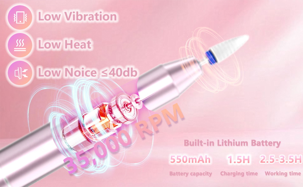 Genießen Sie die Freiheit eines kabelosen Designs! Der Nagelfräser verfügt über einen leistungsstarken 550 mAh Akku, der in nur 1,5 Stunden vollständig aufgeladen werden kann. Mit einer Betriebsdauer von 2,5 bis 3,5 Stunden können Sie Ihre Maniküre ohne Unterbrechungen durchführen.