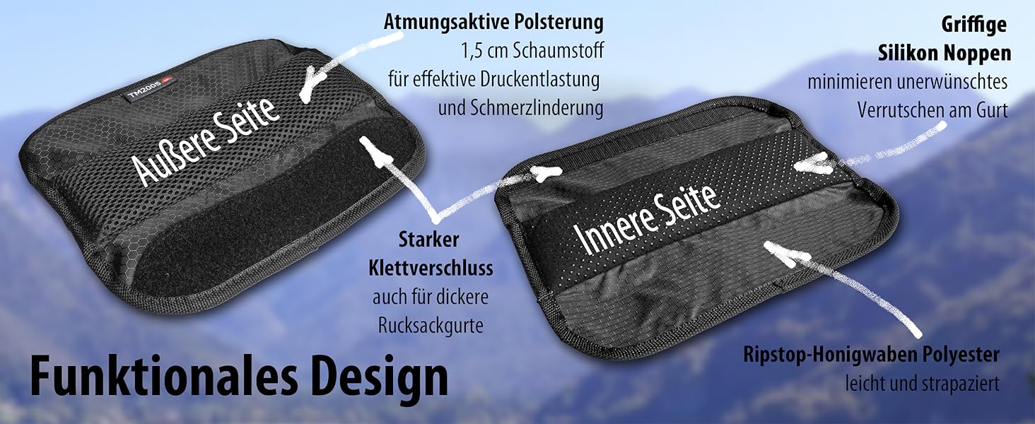 Mit einer Dicke von über 1 cm bieten die Schulterpolster eine effektive Druckentlastung, die Ihre Schultern vor unangenehmem Druck und Schmerzen schützt. Die atmungsaktive Mesh-Oberfläche sorgt dafür, dass Sie auch an warmen Tagen nicht ins Schwitzen geraten.