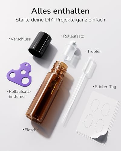 Mit unserem kompletten Zubehör-Set haben Sie alles, was Sie für Ihre DIY-Projekte benötigen! Enthalten sind die bernsteinfarbenen Glasflaschen, Edelstahl-Rollaufsätze, Schraubdeckel, ein Roller-Entferner, Pipetten zum Befüllen sowie Etiketten zum Beschriften. So gestalten und organisieren Sie Ihre Öle, Parfums und Flüssigkeiten mühelos nach Ihrem Geschmack.