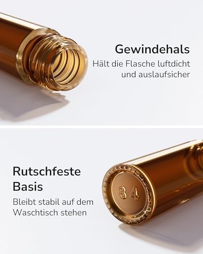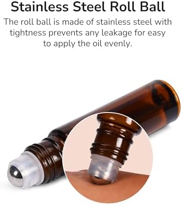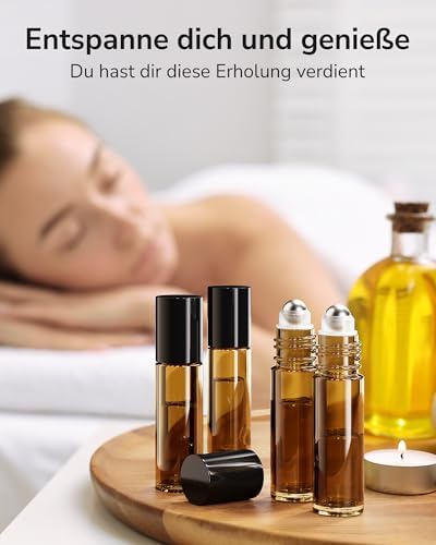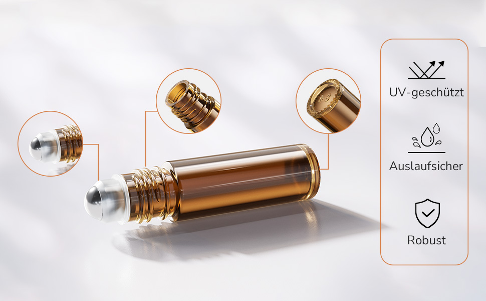 • Hochwertiges Material: Unsere Roll-On Flaschen bestehen aus dickem, strapazierfähigem Bernstein-Glas, das UV-Strahlen blockiert und die Wirksamkeit Ihrer ätherischen Öle bewahrt.