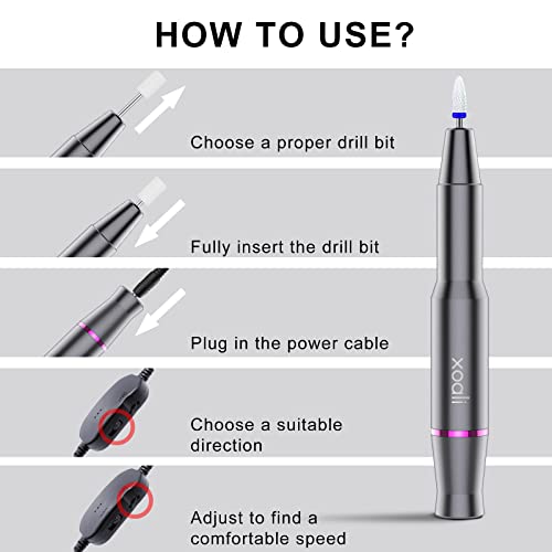 Das Xoali elektrische Nagelfräser-Set bietet eine optimale Lösung für alle Ihre Nagelpflegebedürfnisse. Es enthält alles, was Sie brauchen: einen hochwertigen Mais-Keramik-Bit, 6 Schleif-Bits, 5 Polier-Bits, ein USB-Kabel, 56 Schleifbänder, eine Staubbürste und eine umfassende Bedienungsanleitung. Diese Anleitung in den Landessprachen erklärt die Verwendung der verschiedenen Bits und ist besonders anfängerfreundlich. Ideal für Kunstnägel, Maniküre, Pediküre sowie die Entfernung von Nagelpilz und Hornhaut.
