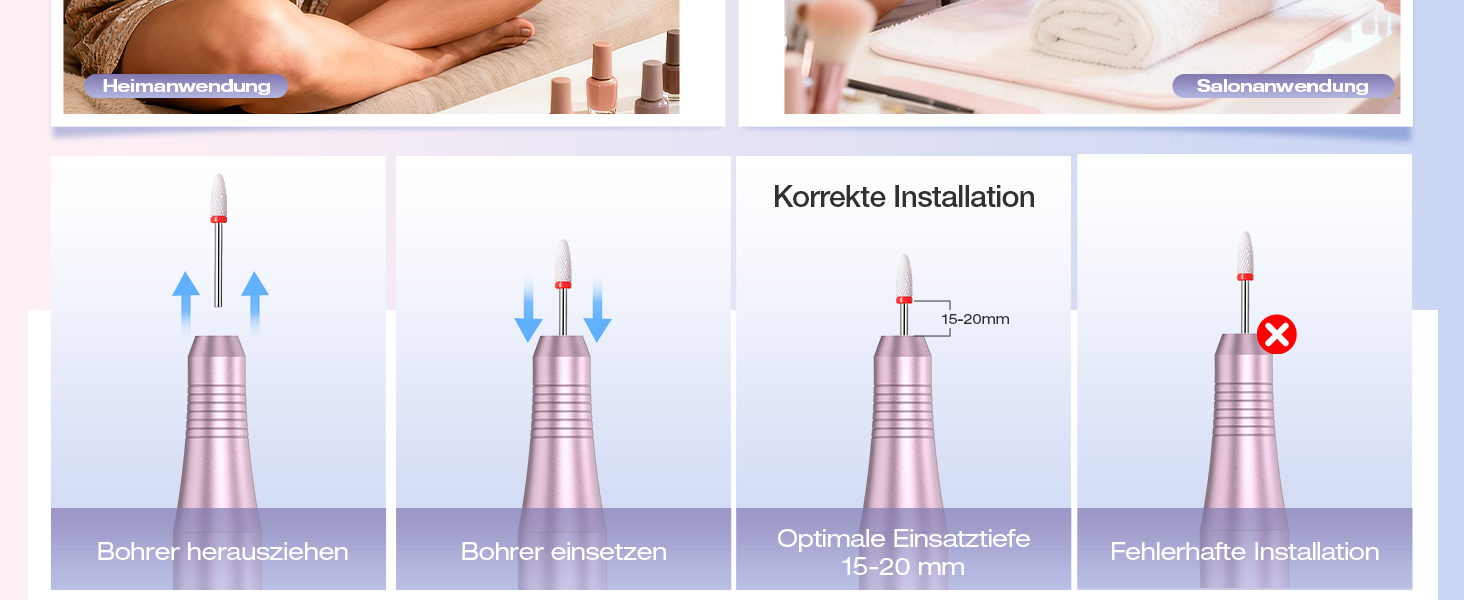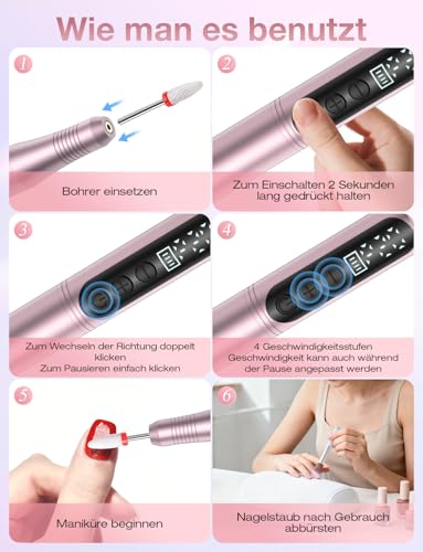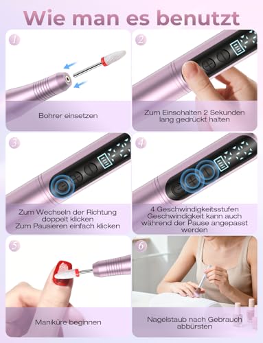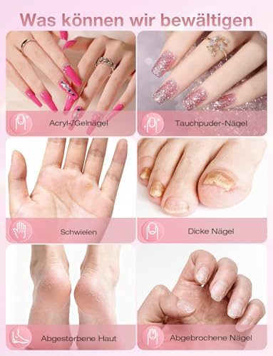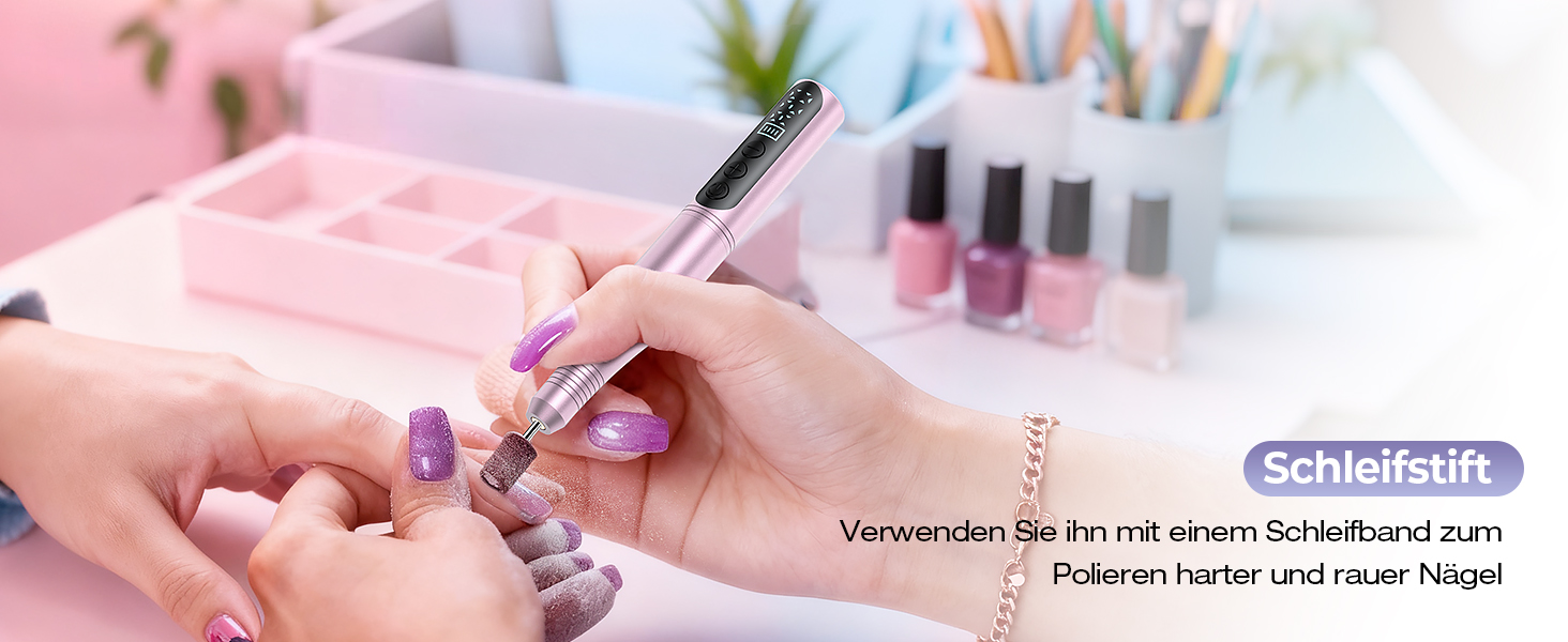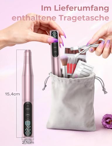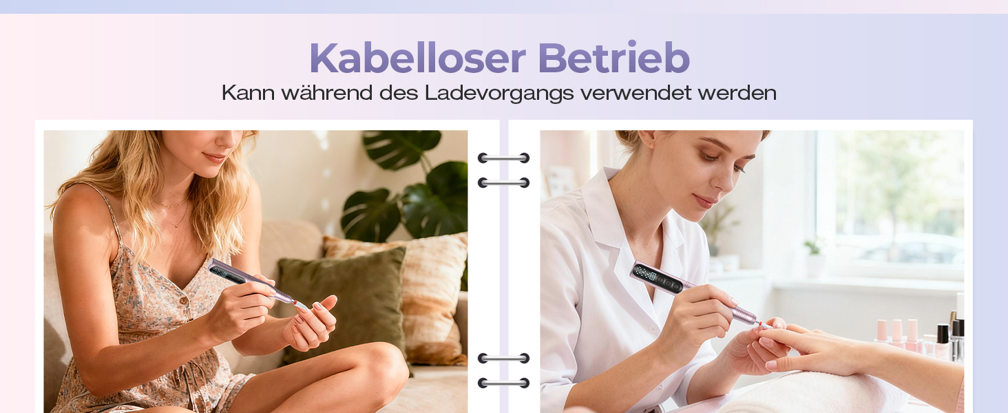 Ob für den täglichen Gebrauch, beim Reisen oder für professionelle Nagelstudios, unser kabelloser Nagelfeiler bietet Ihnen alles, was Sie benötigen, um Ihre Nägel optimal zu pflegen und zu gestalten. Investieren Sie in dieses Komplettset und genießen Sie die Vorteile, die es mit sich bringt – für eine rundum persönliche Nagelpflegeerfahrung!