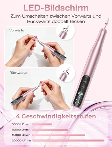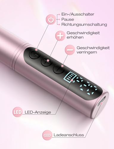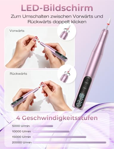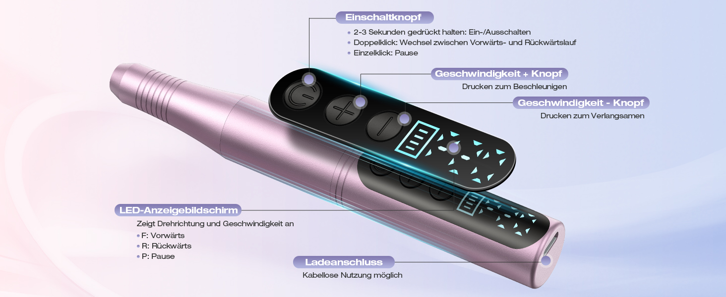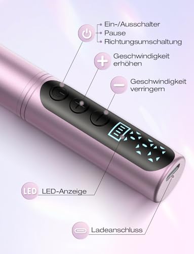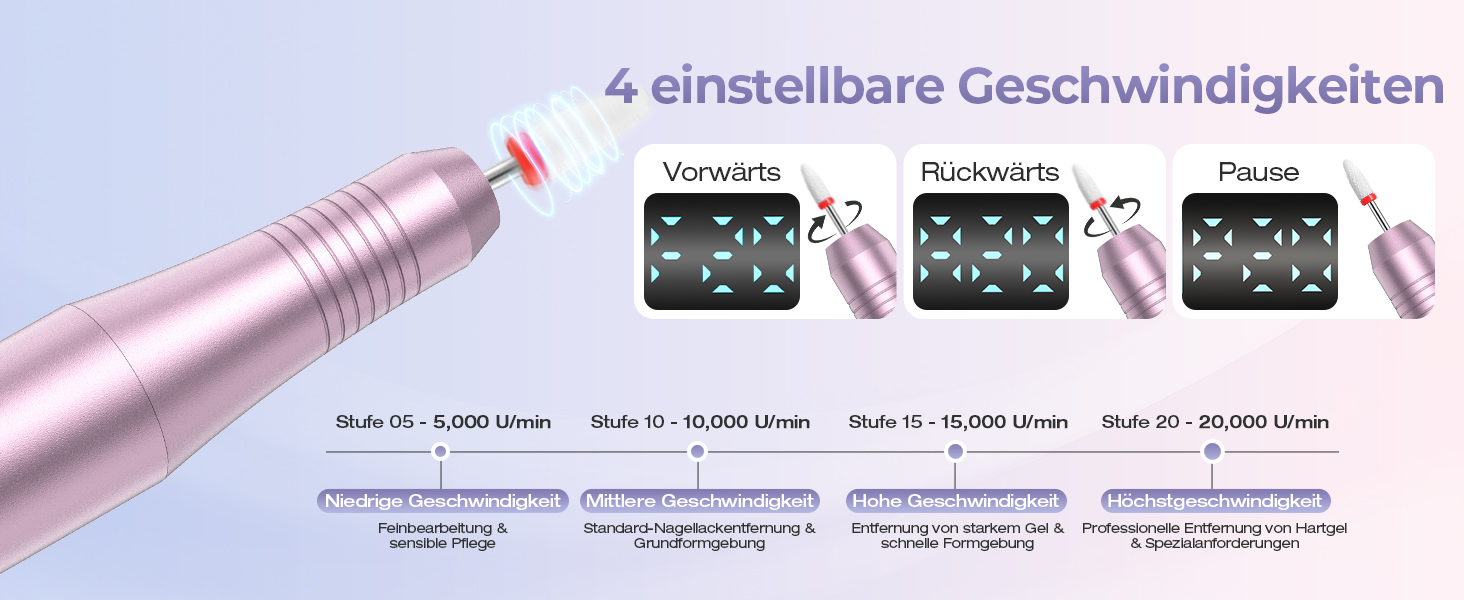Mit der Möglichkeit, sowohl mit der linken als auch mit der rechten Hand zu arbeiten, bietet unser Nagelfeiler eine benutzerfreundliche Erfahrung für alle. Das integrierte LED-Display informiert Sie über den Akkustand und die gewählte Geschwindigkeitsstufe. Wählen Sie zwischen 4 Drehzahlstufen (5.000–20.000 U/min), um Ihre Feilarbeit, das Polieren oder die Gellackentfernung optimal zu gestalten. So haben Sie die volle Kontrolle über jeden Schritt Ihrer Nagelpflege.