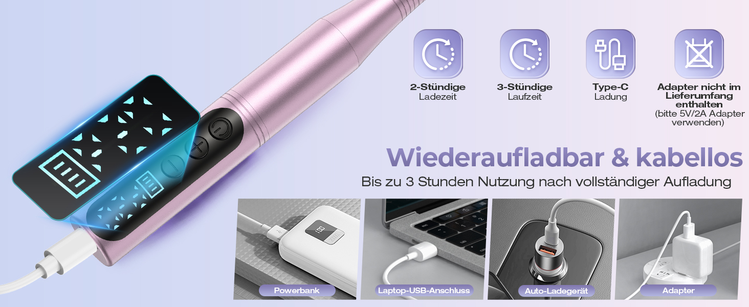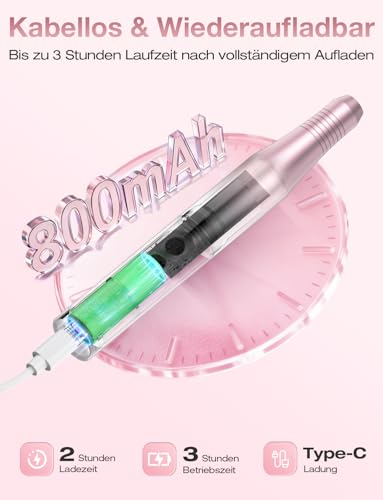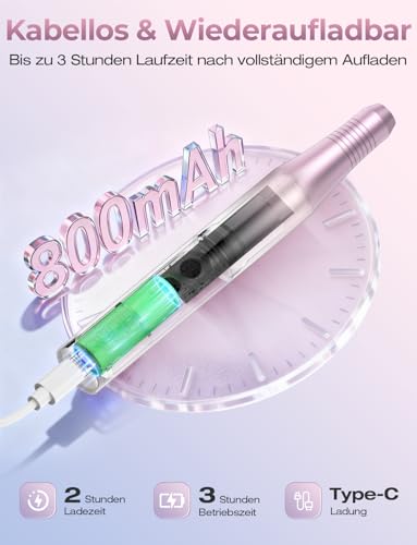 Dieser kabellose Nagelfeiler ist aus einer robusten Aluminiumlegierung gefertigt und bietet eine ideale Kombination aus Stabilität und geringem Gewicht. Das kompakte Design passt mühelos in jede Kosmetiktasche und ermöglicht es Ihnen, ihn jederzeit und überall zu verwenden. Das aufladbare Akkusystem garantiert Ihnen Zuverlässigkeit und Flexibilität, sowohl im eigenen Badezimmer als auch im Nagelstudio oder auf Reisen.