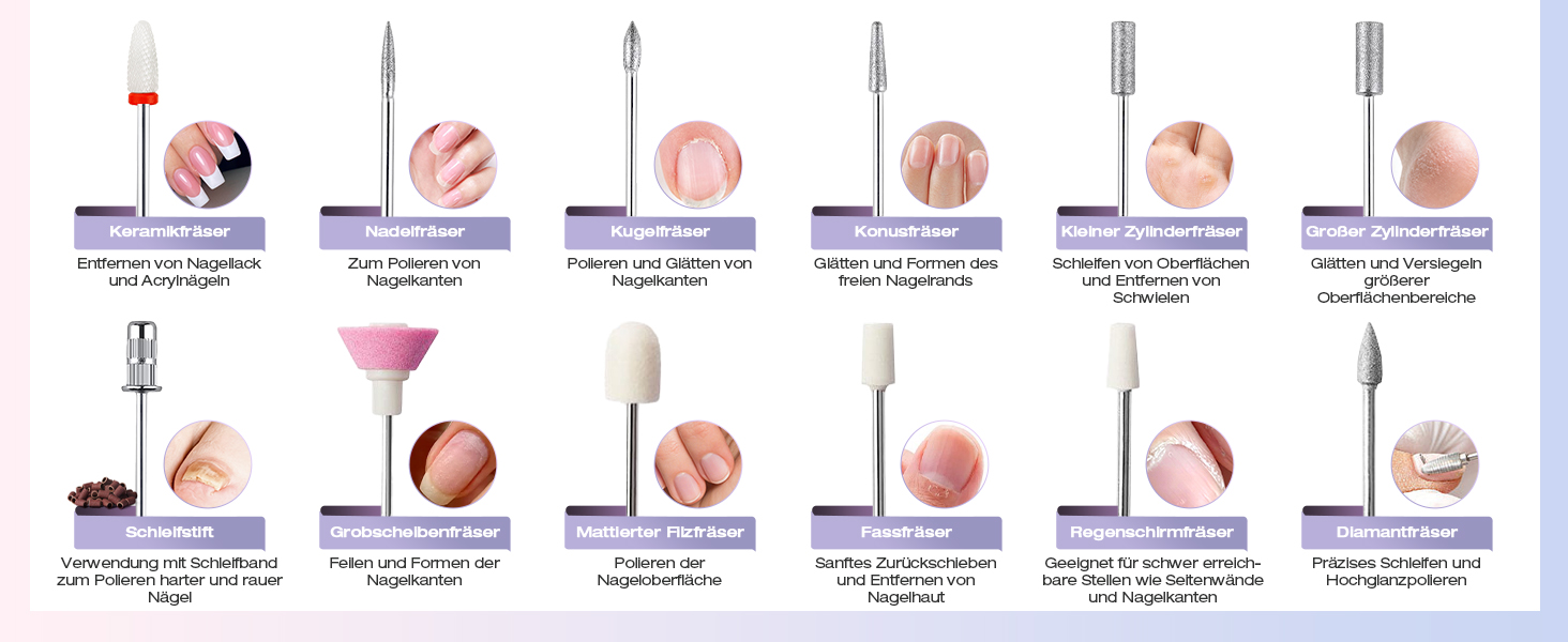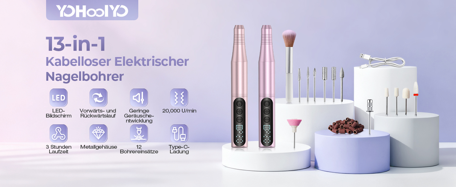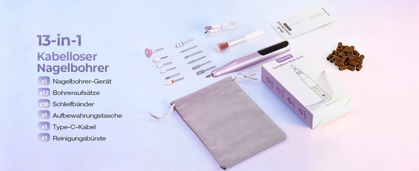 Entdecken Sie die neueste Innovation im Bereich der Nagelpflege mit unserem 13-in-1 Komplettset. Mit 12 hochwertigen Schleifaufsätzen (7 aus Metall und 5 aus Keramik) inklusive Polierer und Bürste sind Sie bestens ausgestattet, um all Ihre Nagelpflegebedürfnisse zu decken. Der benutzerfreundliche Druckentlastungs-Bohrfutter ermöglicht einen schnellen und einfachen Wechsel der Aufsätze. Dank der praktischen Tragetasche bleibt alles ordentlich und griffbereit – egal ob zu Hause oder unterwegs.